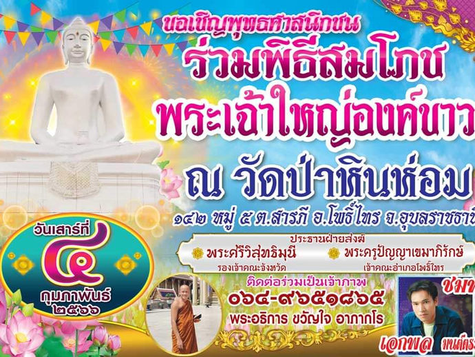 Title : ขอเชิญพุทธศาสนิกชน ร่วมพิธีสมโภช พระเจ้าใหญ่องค์ขาว Start : วันเสาร์ที่ ๔ กุมภาพันธ์ ๒๕๖๖ Location : ณ วัดป่าหินห่อม ๑๔๒ หมู่ ๕...