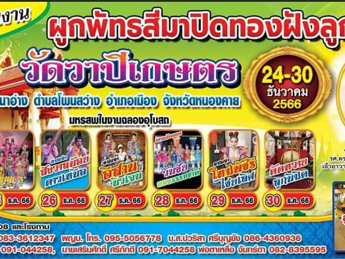 Title : ขอเชิญร่วมงาน ผูกพัทธสีมา ปิดทอง ฝังลูกนิมิต Start : ๒๔ ∽ ๓๐ ธันวาคม ๒๕๖๖ Location : ณ วัดวาปีเกษตร บ้านนาอ่าง ตำบลโพนสว่าง...