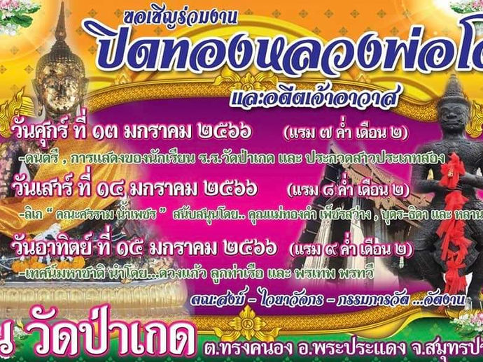 ขอเชิญร่วมงาน ปิดทอง หลวงพ่อโต และ อดีเจ้าอาวาส วันที่ ๑๓ ∽ ๑๕ มกราคม ๒๕๖๖ ณ วัดป่าเกด ตำบลทรงคนอง อำเภอพระประแดง จังหวัดสมุทรปราการ ๑๓...