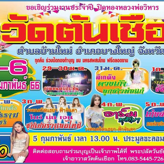 Location : ณ วัดต้นเชือก ตำบลบ้านใหม่ อำเภอบางใหญ่ จังหวัดนนทบุรีทุกคืน ร่วมปิดทองทำบุญ ชม มหรสพสมโภช ฟรีตลอดงาน